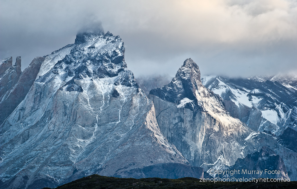 Up early at Hosteria Lago Grey, at the end of a glacial lake, but the weather was not entirely cooperating and what there was of the dawn was fleeting. Cerro Paine Grande at the rear middle left, with Cerro Catedral behind to the left and Cuernos del Paine behind at the right.