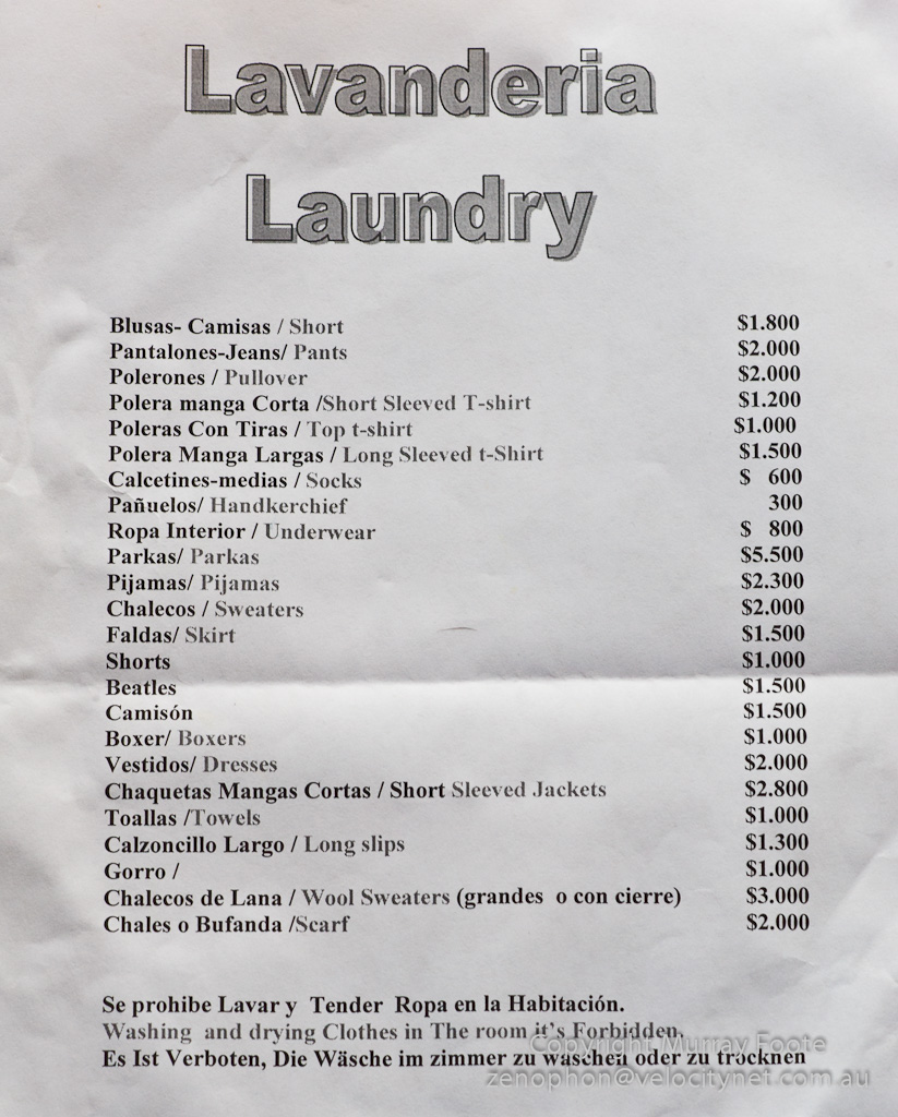 The view from our room (left) helped us know when to go to catch the light. The laundry list (right) included beatles for 1,500 pesos. Since we didn’t have any beatles in our party we were unable to get any laundered. (Click on the image if you’re curious).