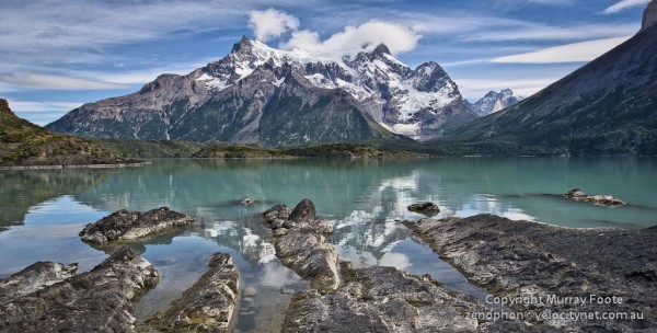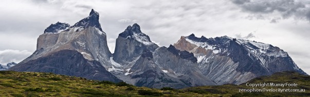 This is a view of the Cuernos del Paine from a viewpoint close to the one above. It clearly shows the dramatic striations which I think are black for lava and pink for granite.