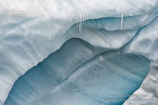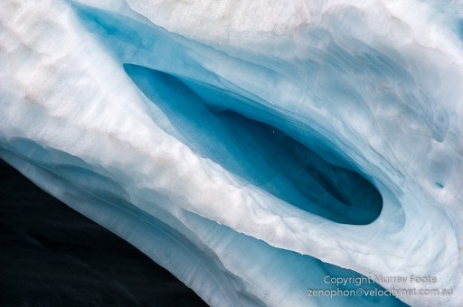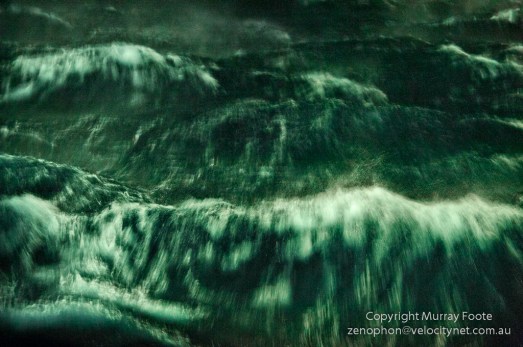 In the evening we headed off towards Plenau Island, carefully navigating using the ship’s searchlight to avoid icebergs. This is a shot of waves off the bow of the ship, taken at night using the glow of the searchlight as the light source.