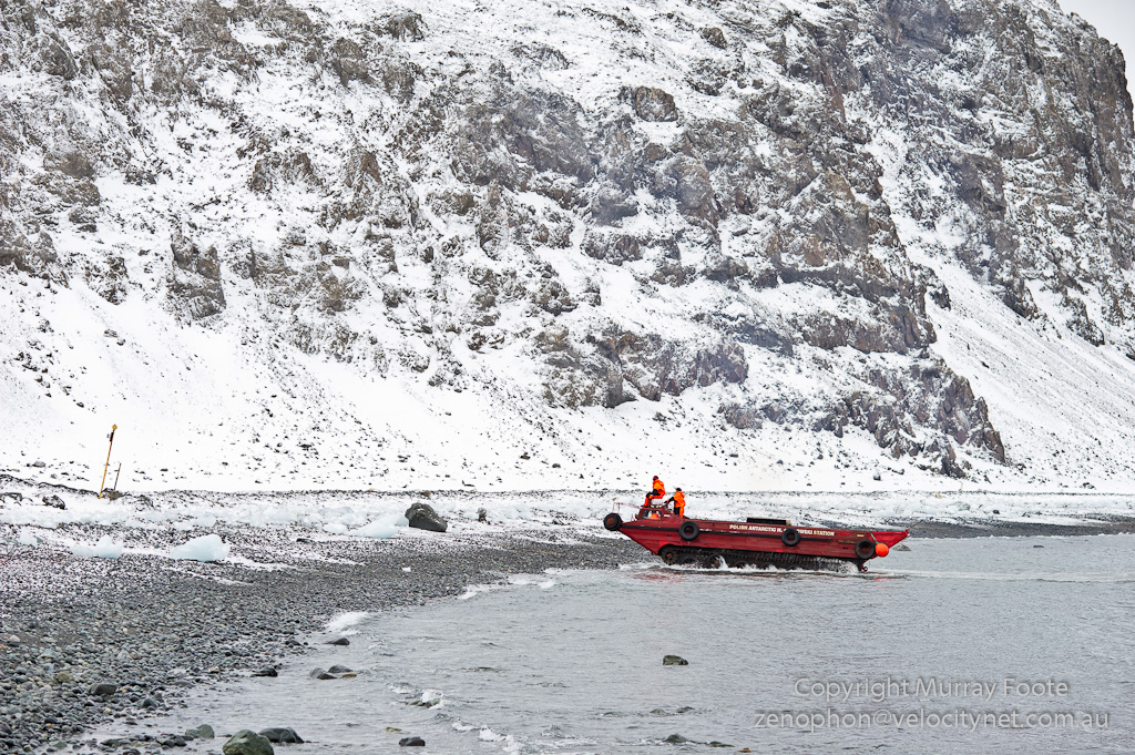 We had arrived at the Polish Arctowski Station to offload winter supplies and scientists. The Poles here have an amphibious vehicle which you see here unloading supplies from the ship.