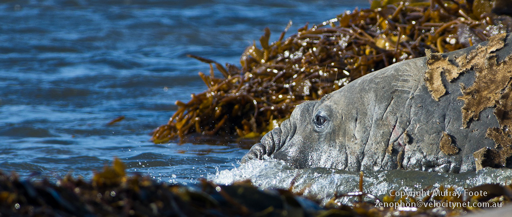 The beachmaster slips into the water to try to ease the moulting torment including scraping against the rocks in the sea