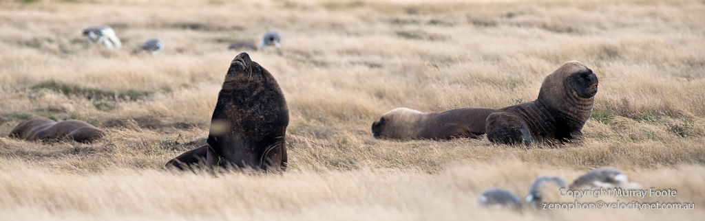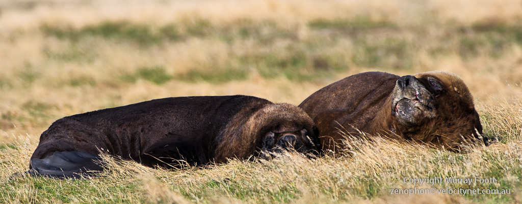 There were also a large number of sea lions up on the grass about 50 metres from the shore. They were in pairs and the males are about twice as large as the females and have large “manes”. They seemed to have lots of scars on their faces, often quite fresh, from their tiffs. They can also move surprisingly fast, faster than we could run. They were giving good displays when I first turned up but I went to the elephant seals first and when I went to photograph the sea lions they were mainly lying down in the grass and quiescent. Ah well, you can’t be everywhere. No point going up to them and poking them with a stick. Still, I still got a couple of interesting images: