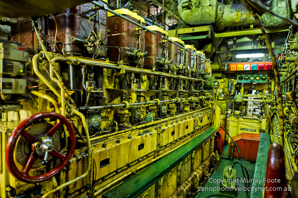 There were several tours of the ship’s engine room and I went on one of them. Above is the ship’s massive engine – one bank of cylinders to the left and you can just see the edge of the other to the right.