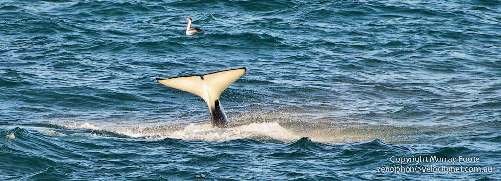 (That’s a cormorant behind the orca that is showing a bit of tail as it goes down).
