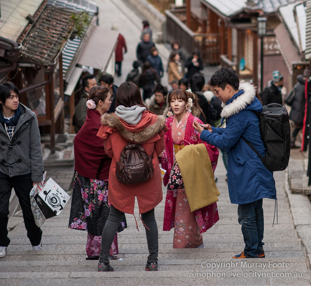 There were quite a few young women wearing kimonos amongst the crowd at the Kiyomizu-dera temple and in the Gion district below. They might have been Geisha, or Maikos (apprentice Geisha) or probably just young women wearing traditional dress. The area north-west of Kiyomizu-dera and between the river and the hills has many charming streets preserved with traditional buildings.