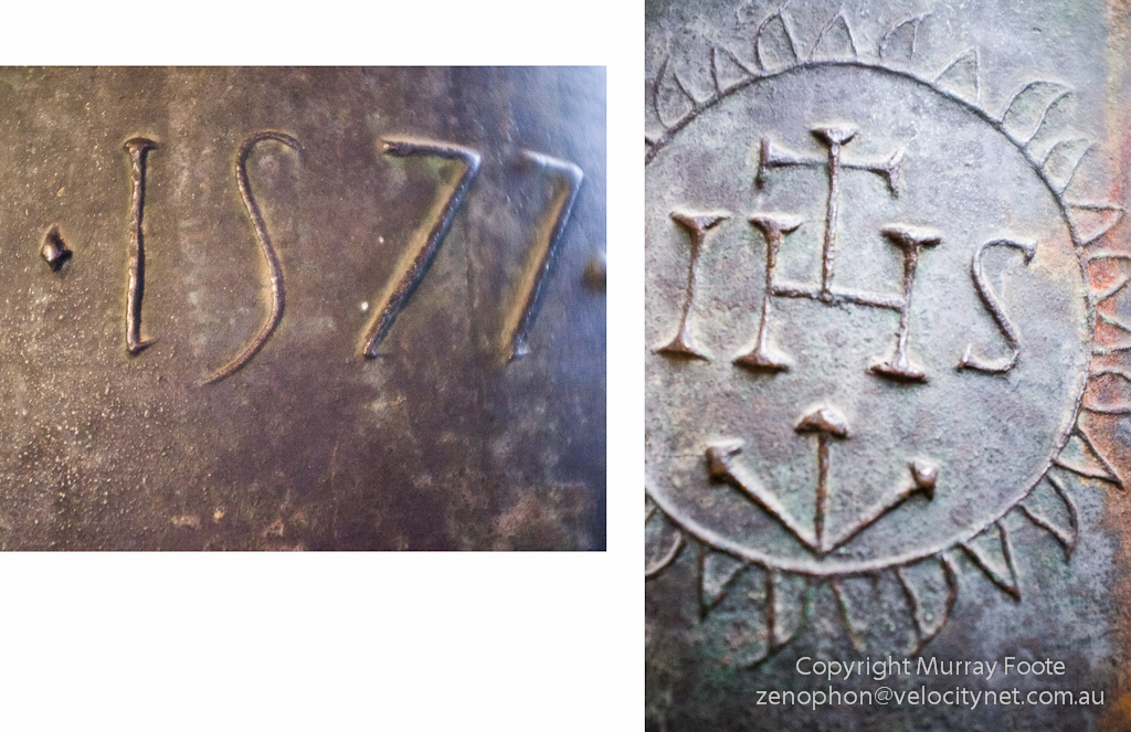 Details of a Christian bell in the Shunko-In temple, dating from 1577. The Abbot's father hid it during World War 2 to prevent it being melted down for munitions.
