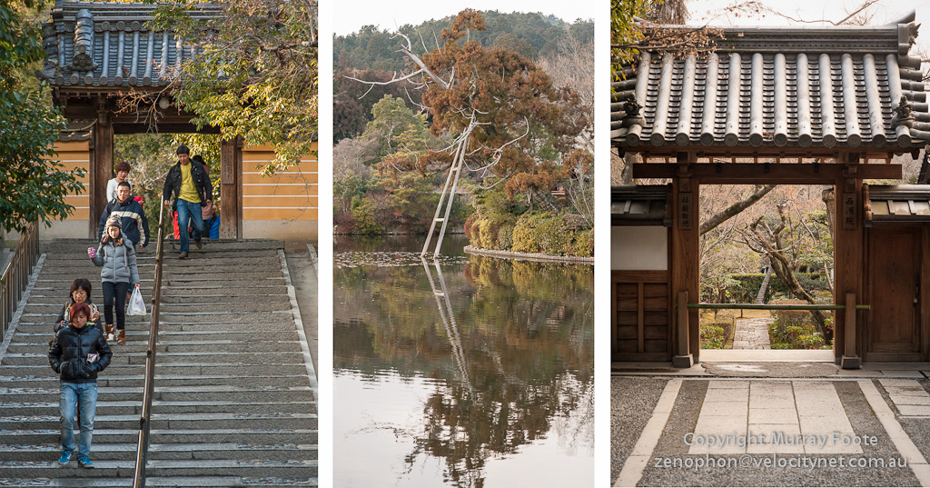 From left to right: Stairs up to the gate to the temple, taken from the road; a very old tree in the lower garden with a supporting structure; a gate inside the temple complex to a garden closed to the public