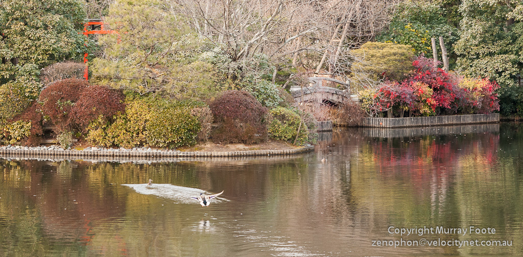 The garden and pond dates back to the 12th century. The red structure you can see through the trees is a Shinto gate associated with a shrine dedicated to Benten, a goddess of luck.