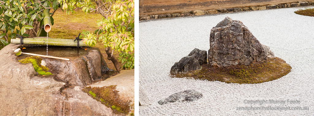 Above, on the left, the bamboo pipe and ladle are for ritual purification. On the right, is a group of stones from Ryoanji's rock garden.
