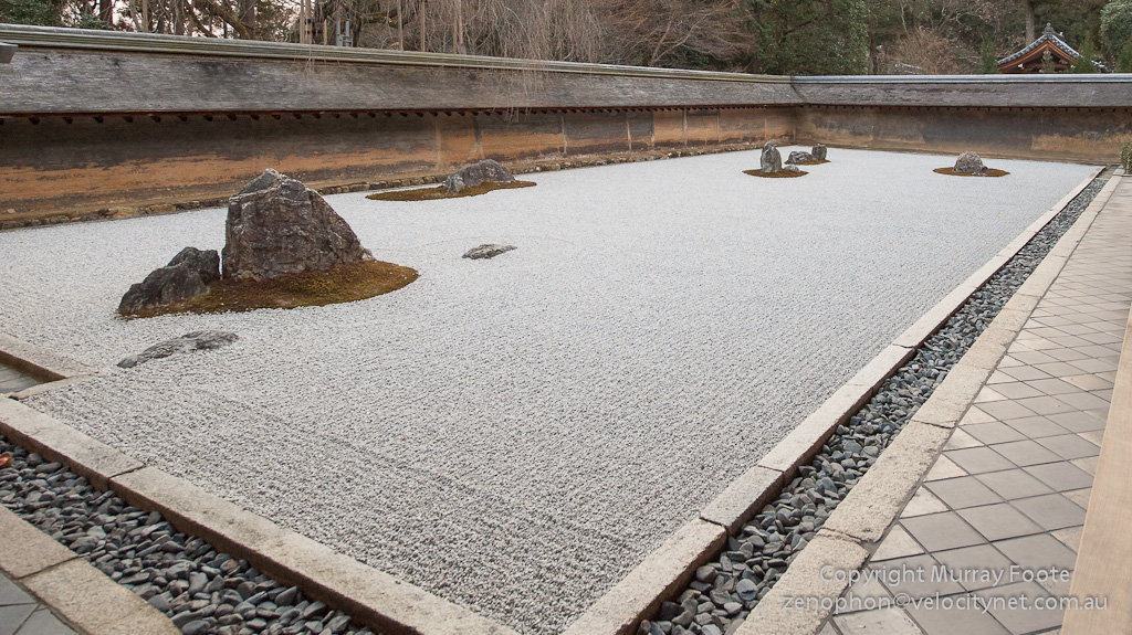 The Ryoanji zen rock garden, one of the most abstract of zen rock gardens, was constructed in the late fifteenth century. It is designed to be viewed from a long verandah that we are at one end of. There are fifteen stones and it is not possible to see any more than fourteen from any position along the verandah. It was designed this way because fifteen is said to be a perfect number and the garden demonstrates that perfection is not possible.