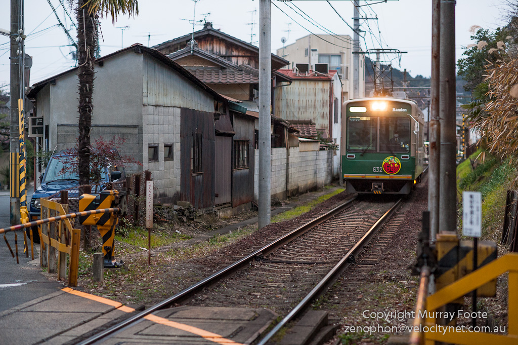 Walking back to my lodgings, I had to stop at a small level crossing for this train. This is a suburban line by a private railway (not Japan Rail). Notice how close the train runs to the houses and the car parked on the other side of the tracks gives you an inkling of how scarce and tight parking places can be in Japan.