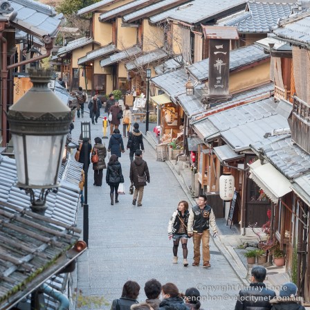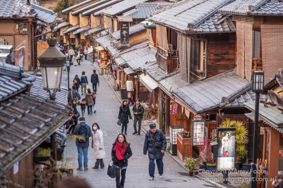 There were quite a few young women wearing kimonos amongst the crowd at the Kiyomizu-dera temple and in the Gion district below. They might have been Geisha, or Maikos (apprentice Geisha) or probably just young women wearing traditional dress. The area north-west of Kiyomizu-dera and between the river and the hills has many charming streets preserved with traditional buildings.