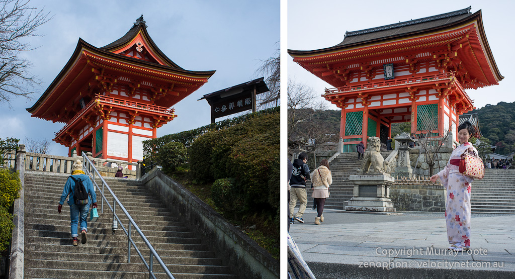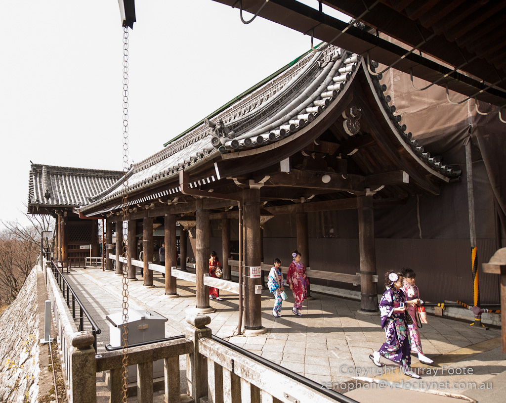 Here is a view of the massive Kiyomizu-dera Temple, with Kyoto in the background. The temple was founded in 798, just after the capital moved to Heian-kyo (Kyoto) so it must have had particular significance in the Heian era (794-1185). The main hall is dedicated to the goddess of mercy and compassion and is supported over the edge of the cliff by 139 wooden pillars 15m in length.