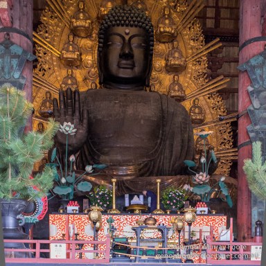 Diabutsu, the giant Buddha, is over 16 metres tall and was completed in 751.  It is said to have used so much bronze that it exhausted the nation’s supply and nearly bankrupted the state.  What you see is not the original.  It was damaged many times by fire and earthquake and recast.