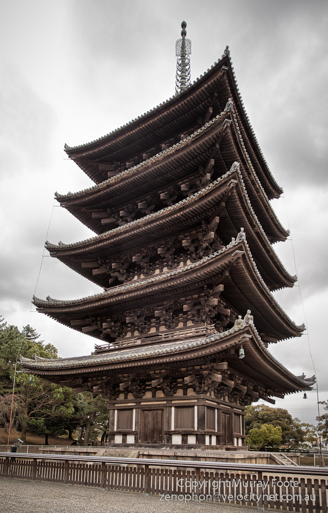 The Goju-no-to or Five Storied Pagoda was originally built in 725 by the Empress Komyoh (consort of the Emperor Shomu).  Destroyed by fire multiple times, the current version dates from 1426.  It is the second highest pagoda in Japan at just over 50 metres.