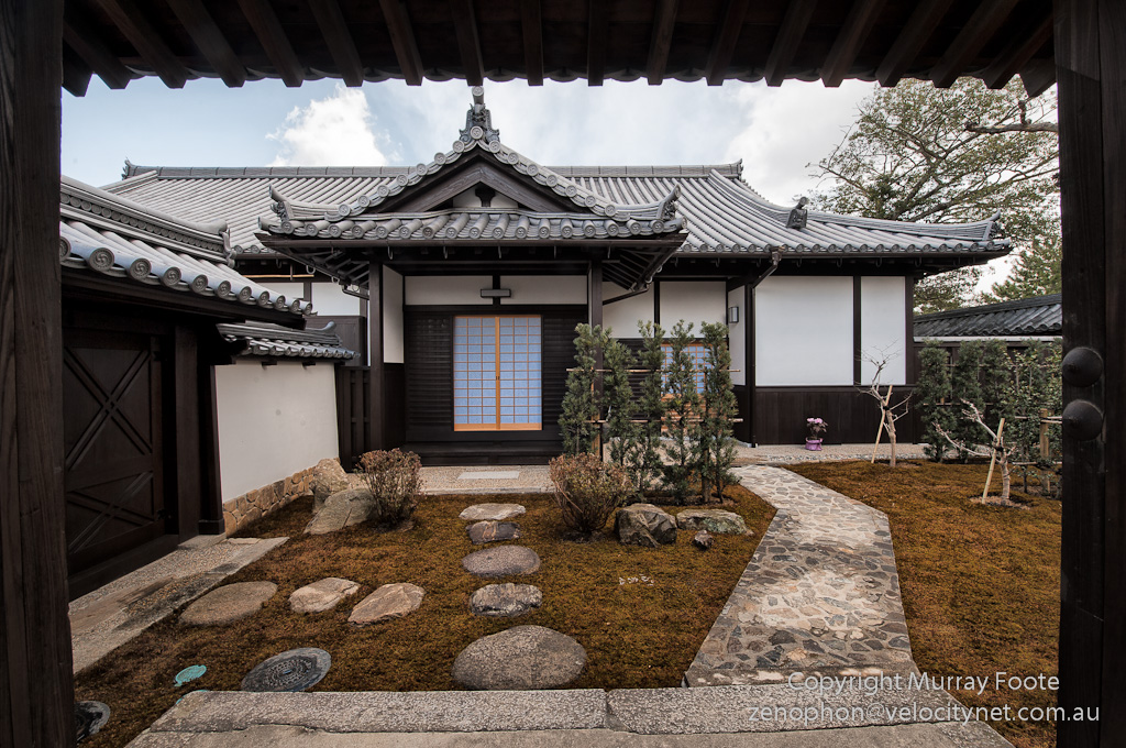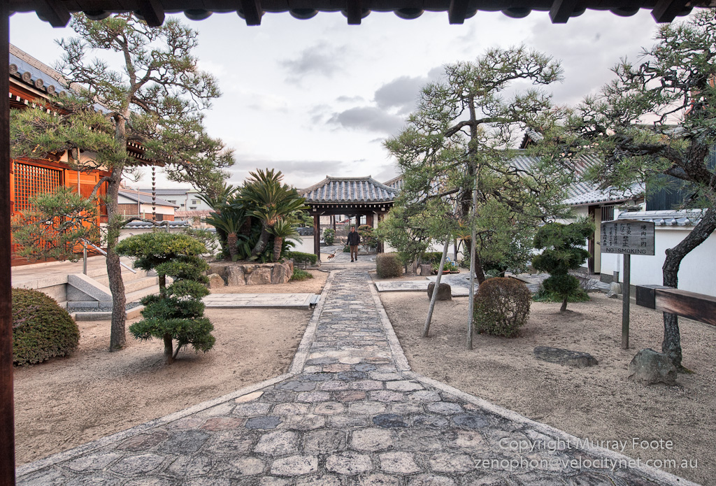 Back in Nara, nearly back to the ryokan, I photographed the courtyard of a small Buddhist temple. You may observe under the far gate, a man (probably a Buddhist Priest) taking his dog for a walk, who just appeared as I was taking the picture.