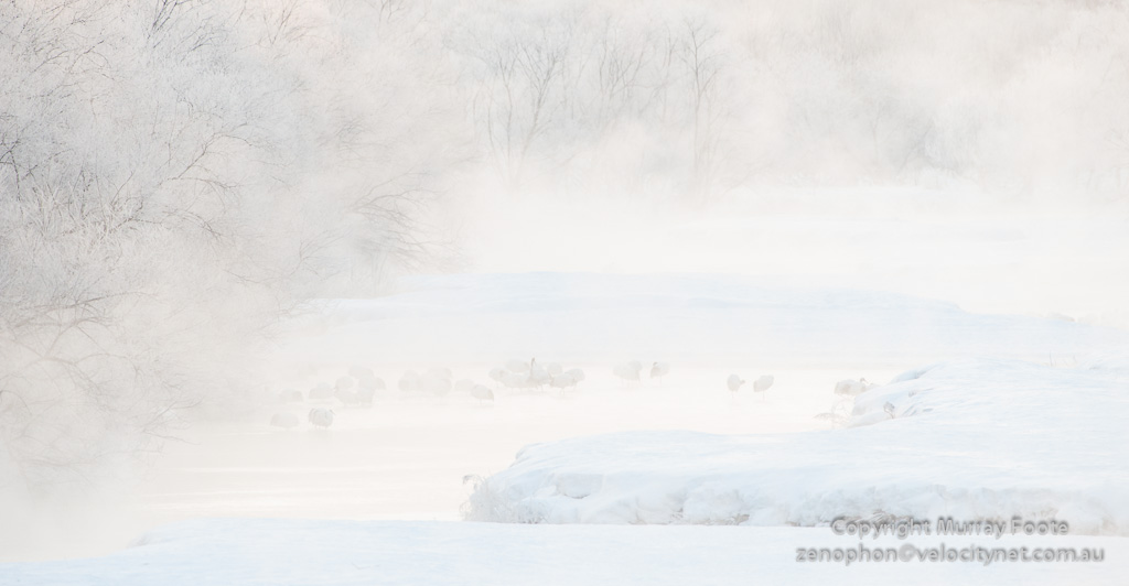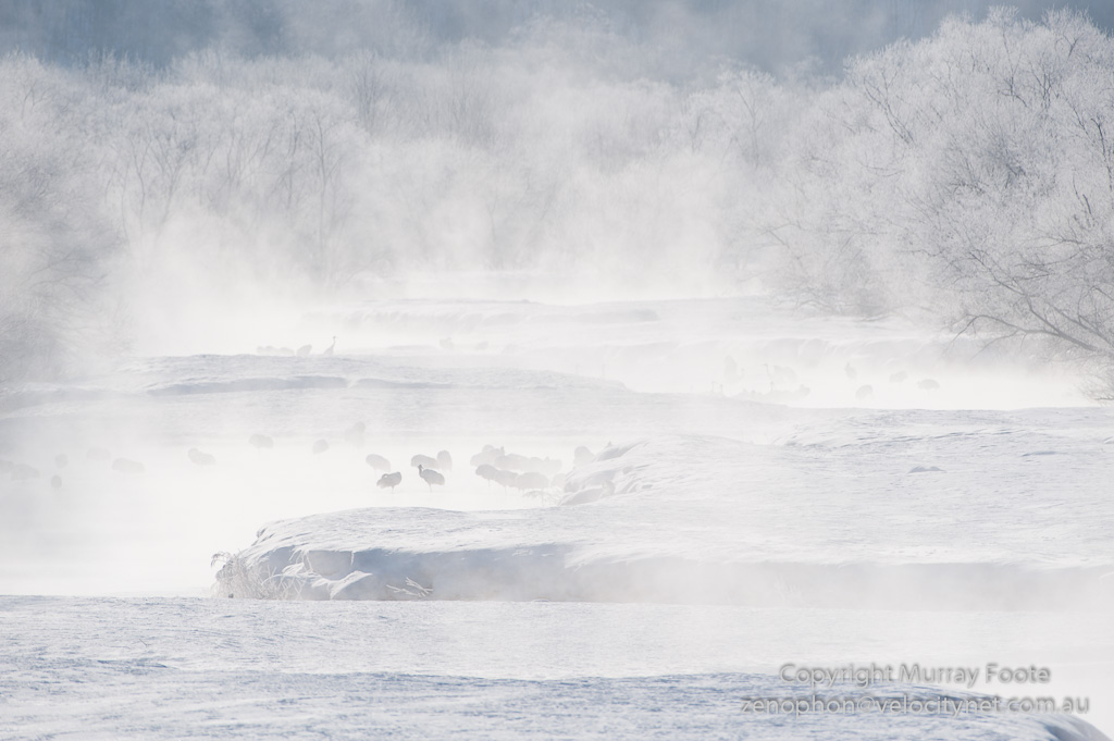 We turned up at Otowa bridge before dawn to photograph red-crowned cranes as they woke up for the day. The temperature was -26˚C (-15˚F) and the dew point was -18˚C (0˚F). I had known what temperatures to expect before leaving for Japan so I was comfortable except that my fingers got a bit cold because it is not possible to operate a camera while keeping heavy over-gloves on.