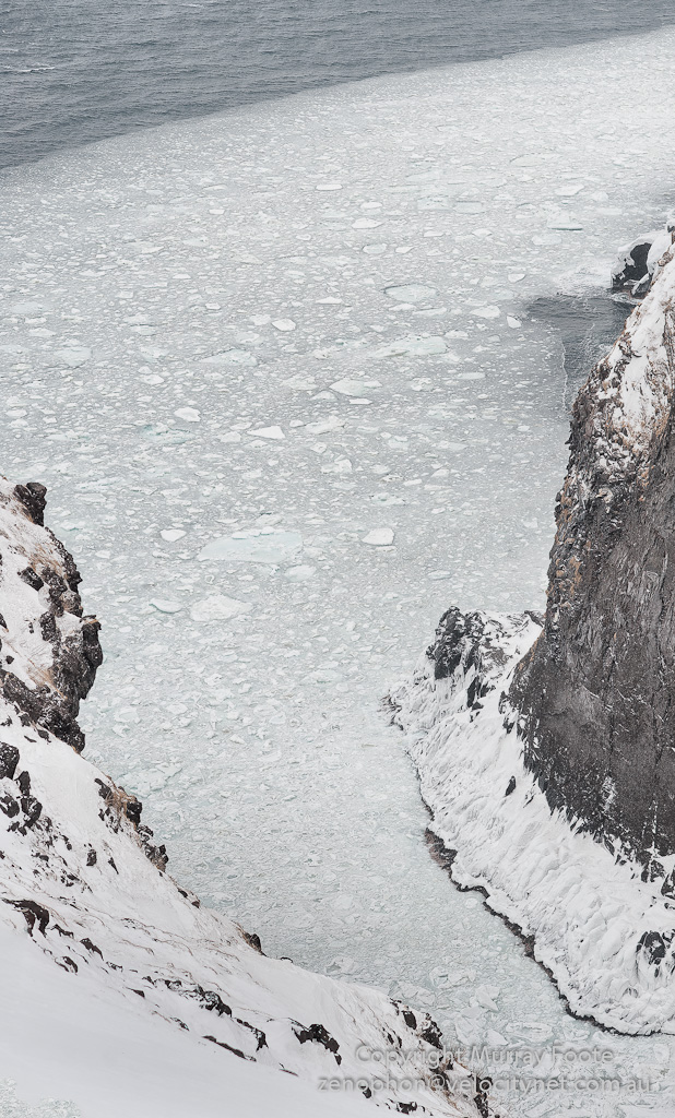 Looking out across the cove to the point, where the previous day there was sea, there is now a veil of sea ice that extends out for hundreds of metres.