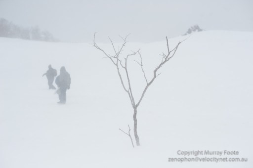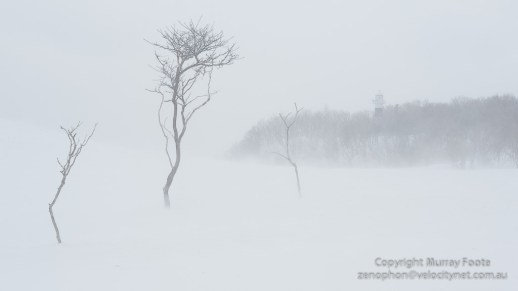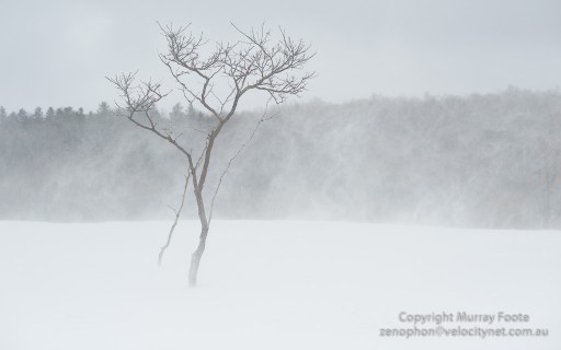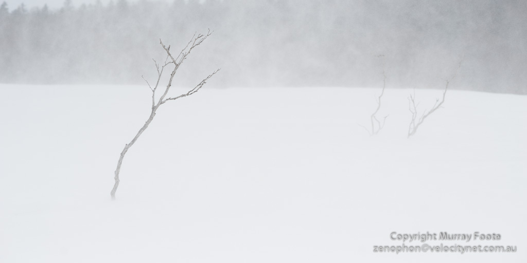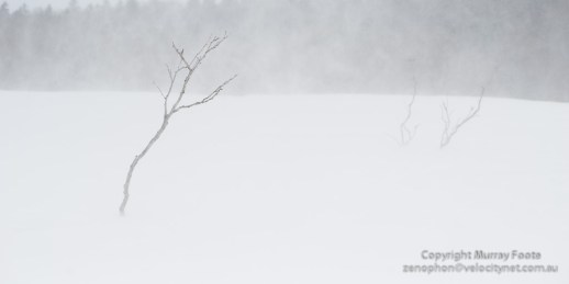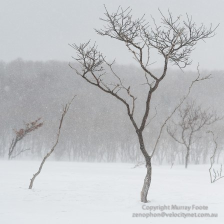 The silhouettes of the straggling trees contrast well with the snow-saturated landscape.