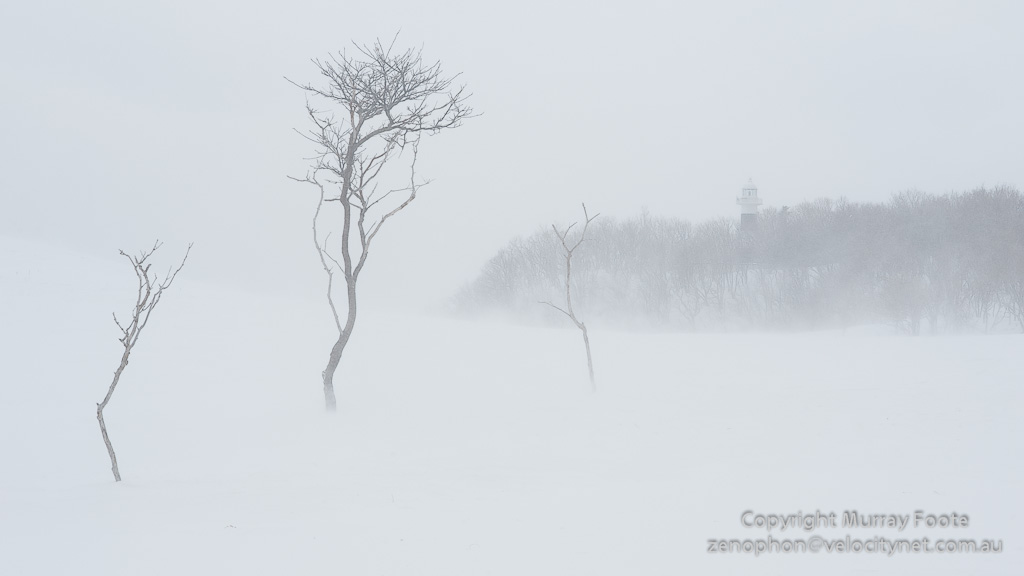 The lighthouse from across the cove as the snow starts to fall heavier and visibility starts to diminish.