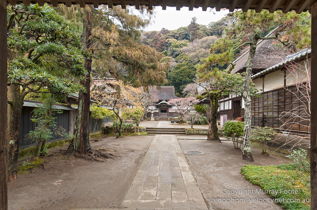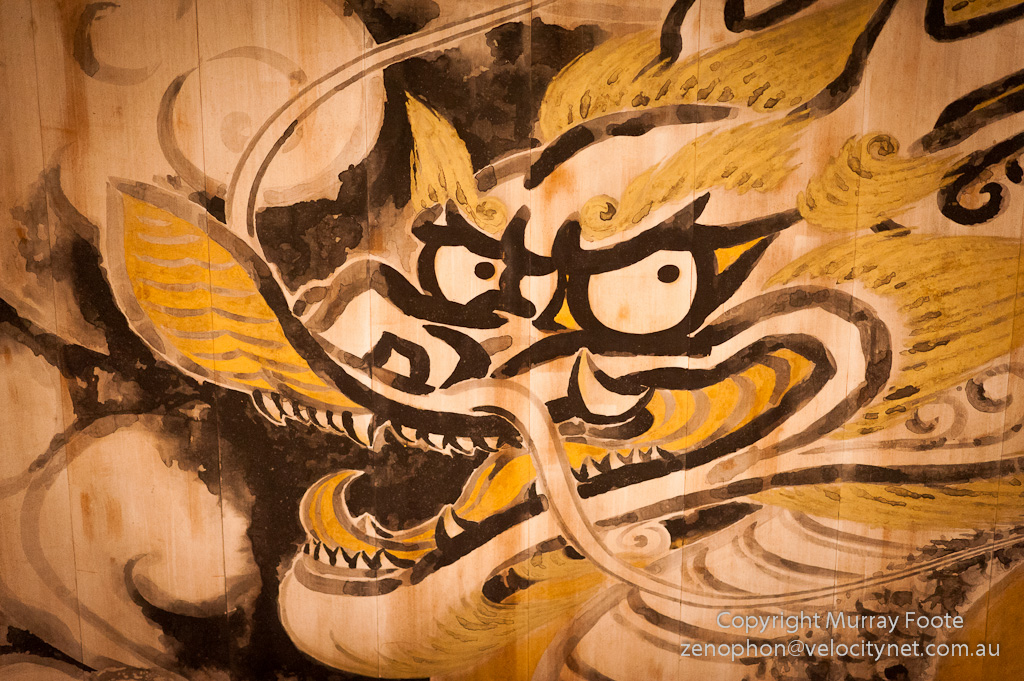 The Buddha (or is it a Boatsu?), Boatsu and Dragon above are in the Butsuden or Main Hall. The head part of the Boatsu is original, dating from the early 14th century; lower parts were restored in 1625. The Boatsu itself is 2.6 metres high, seated. Much of the gold leaf is gone but it is not deemed appropriate to restore it. The dragon is on the ceiling, painted in the early 20th century. The building itself was recreated to the original design after the previous one became severely damaged in the Great Kanto Earthquake of 1923. Most of the complex has been rebuilt at one time or another after damage from fire or earthquake.