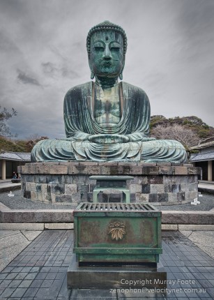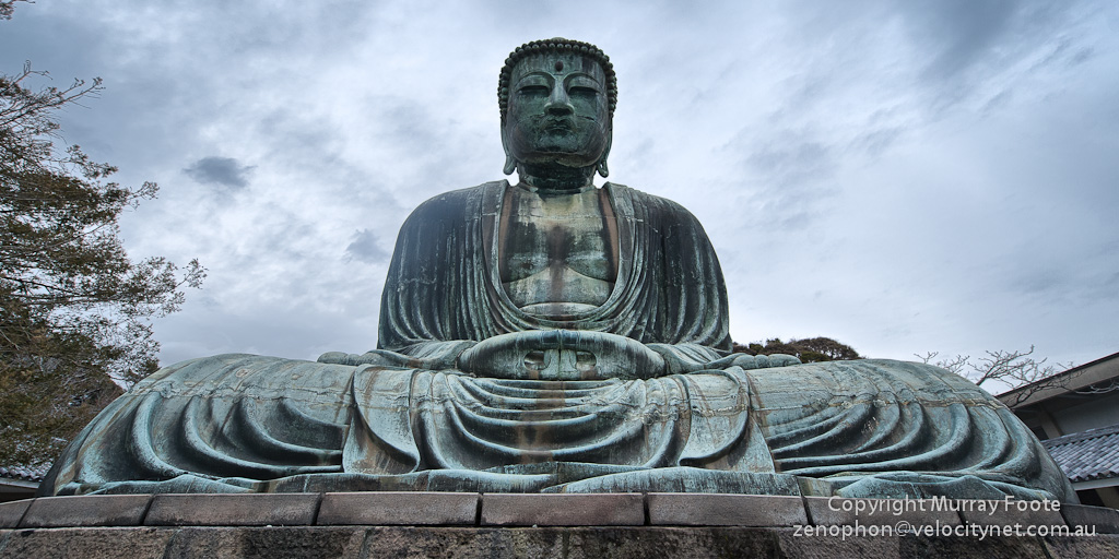 The Diabutsu or Giant Buddha of Kamakura is over thirteen metres tall, weighs 93 tonnes and was cast in bronze in 1252. It is located inside the Kotokuin Temple, which belongs to the Jodo or Pure Land sect of Buddhism. It was originally inside a hall but this was damaged by storms in 1334 and 1369 and then swept away by a tsunami in 1498.