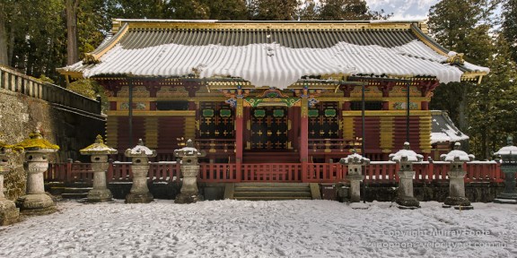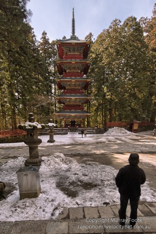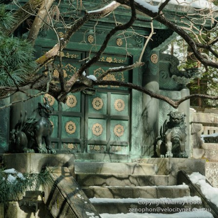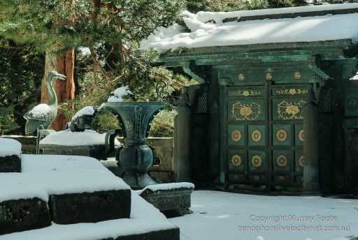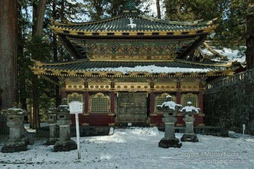 Here we are looking back on the elaborately carved Yomeimon Gate. One of the twelve columns was deliberately carved upside-down, an imperfection to avoid antagonising jealous spirits. Looking closely at the full-sized image, I think it is the middle one to the right, though I did not know to look for this at the time.