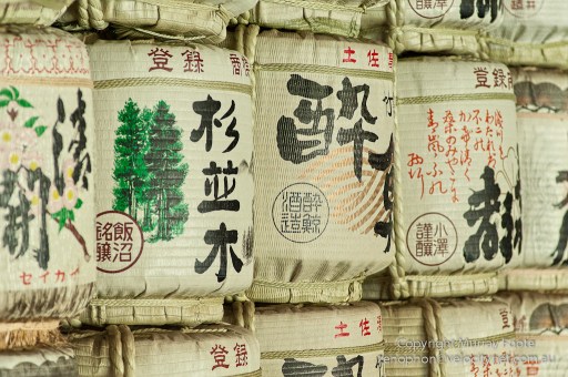 These, I believe, are sake barrels. There were about 200 of them stacked in a long line.