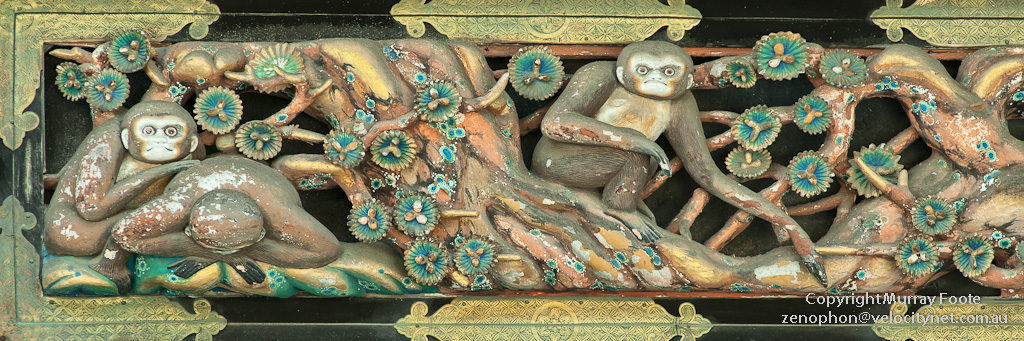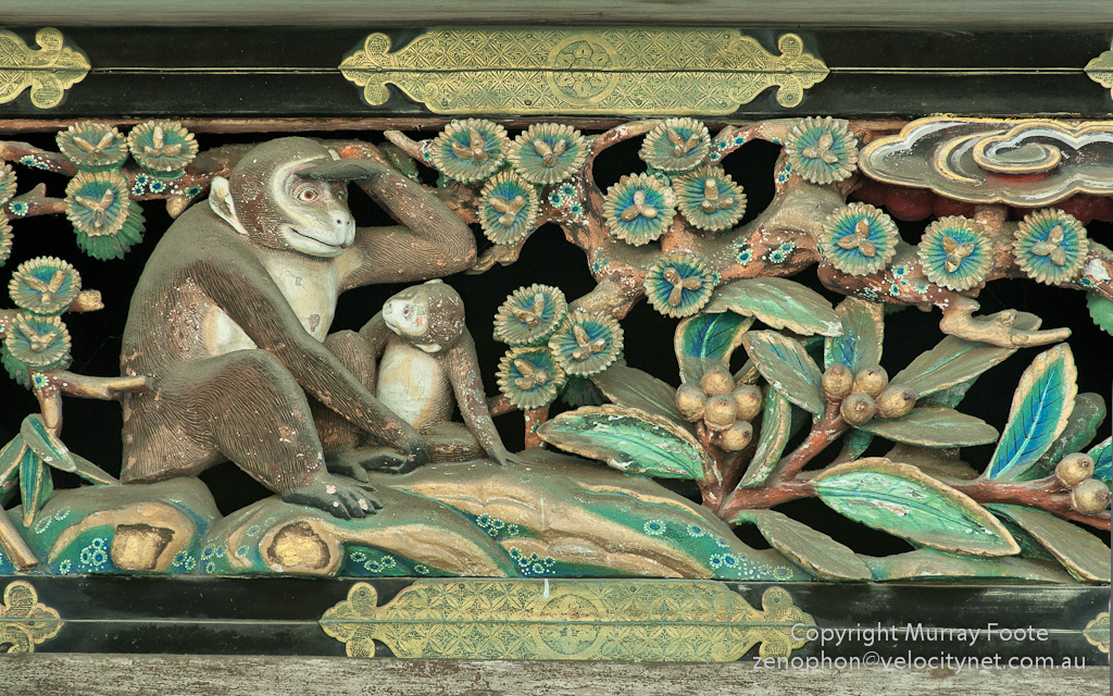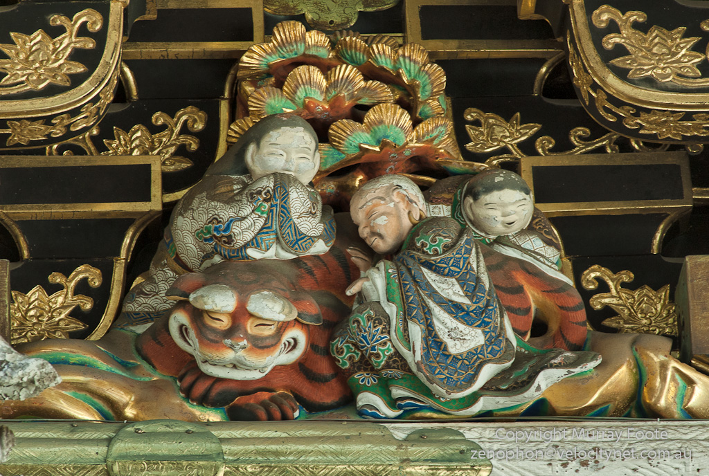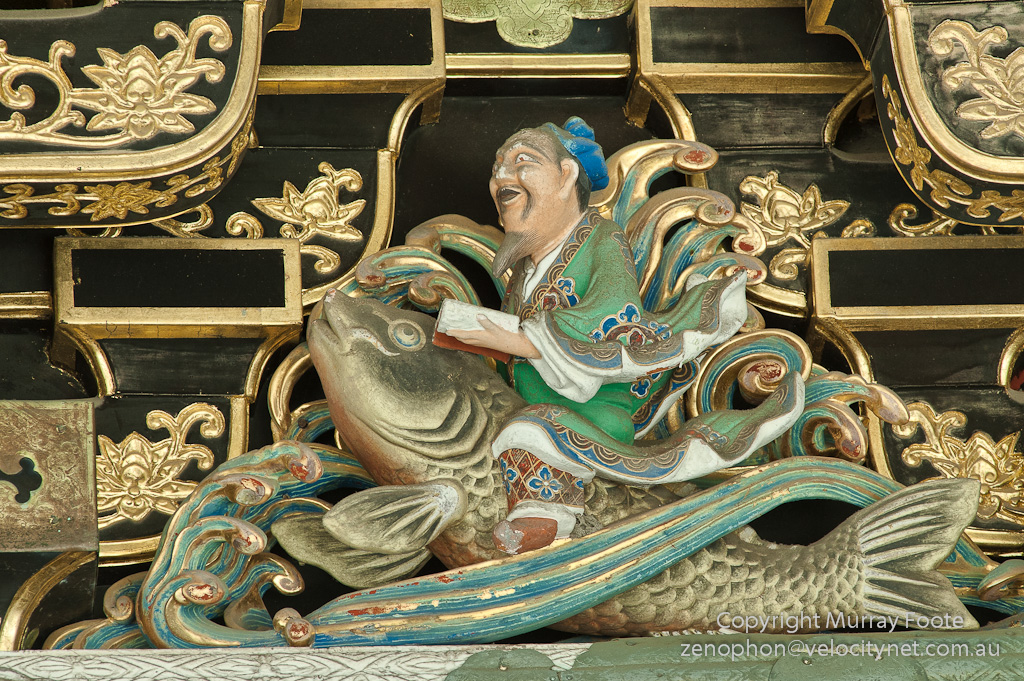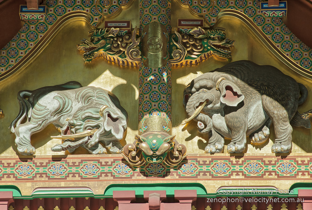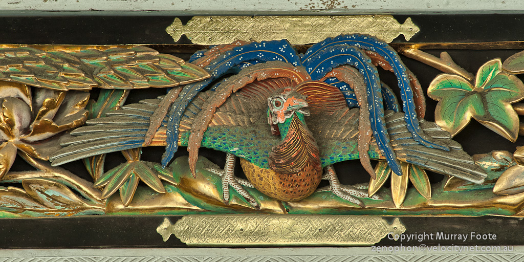 Not far from Taiyuin-byo is Tosho-gu. This is the shrine of Tokugawa Ieyasu, the first Tokugawa shogun. It was greatly expanded from the “small shrine” he requested to the grand complex you see today by his grandson Iemitsu. The first two images (above) are painted carvings from below the roof of one of the Sacred Store-Houses.