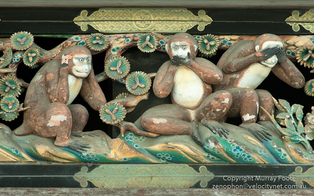 The original three wise monkeys, dating back to the seventeenth century. A painted carving under the roofline of the Sacred Stable.