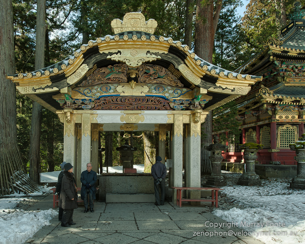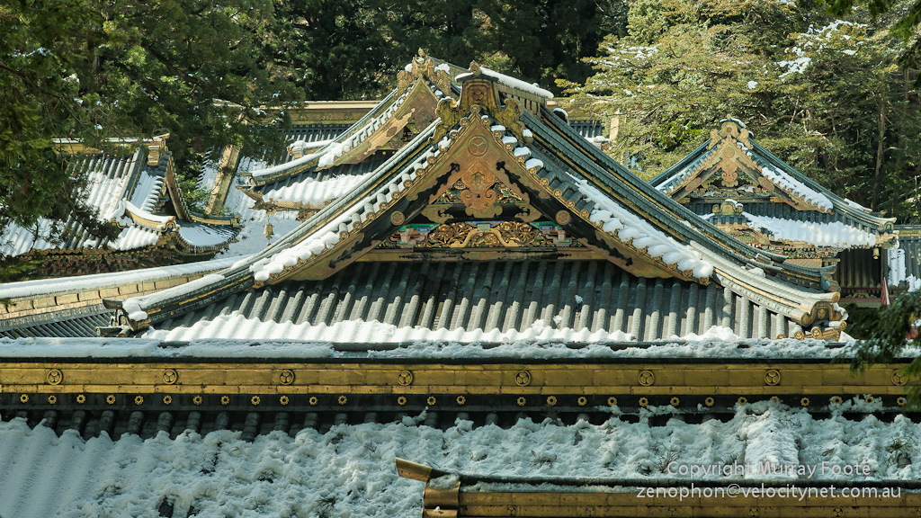 Here we are looking back on the elaborately carved Yomeimon Gate. One of the twelve columns was deliberately carved upside-down, an imperfection to avoid antagonising jealous spirits. Looking closely at the full-sized image, I think it is the middle one to the right, though I did not know to look for this at the time.