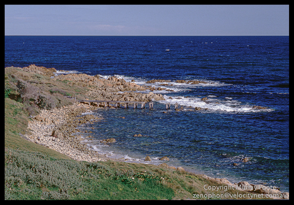 This is the historic lighthouse jetty for Point Hicks lighthouse, clearly no longer in use. This was their sole lifeline in the nineteenth century and even by the 1920s it took two days by horse to reach the nearby settlement of Cann River, only 20 kilometres away. Using the jetty may have required the high tide unless it was originally much longer.
