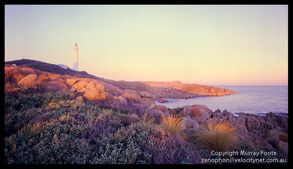 Sunset at Point Hicks on a calm autumn day in 1987. Point Hicks was the first land in Australia sighted by Cook and is named after Lieutenant Zachary Hickes, who first saw land. However, the location he gave in his log was out at sea and since no-one could determine where he had sighted land it was known as Cape Everard. Then in the 1970s, some Melbourne schoolchildren doing a project on Cook realised his log was 24 hours out and correcting for this put Pt Hicks at what was then known as Cape Everard. Consequently the name was restored to Pt Hicks.