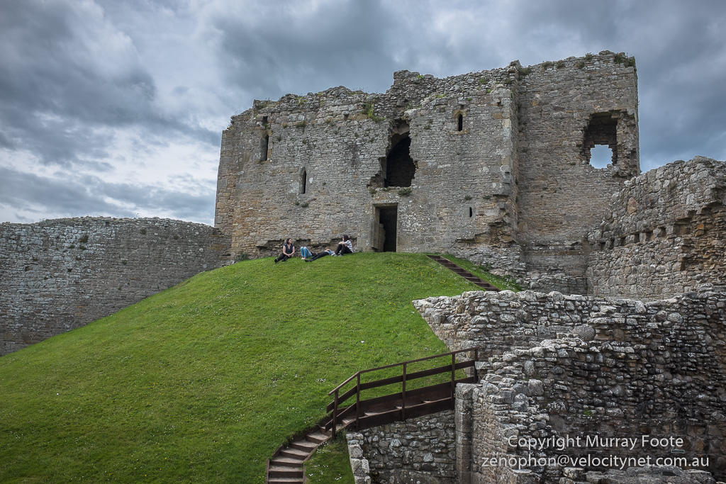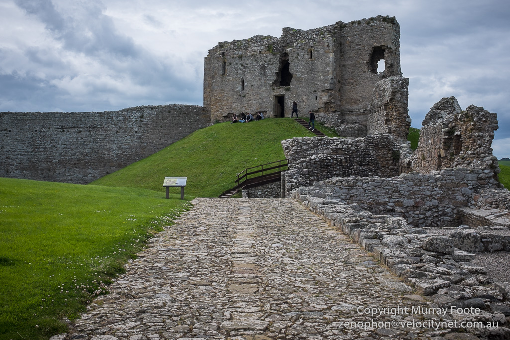 This looks down on the part of the keep that fell away.  Where the plaque in the wall is indicates that there was a toilet there.  Whether anyone was sitting on the loo at the time it became airborne is not recorded.  “This toilet was originally placed on the upper floor adjacent to the lord’s hall, but has come to rest in this awkward position following major subsidence problems”.