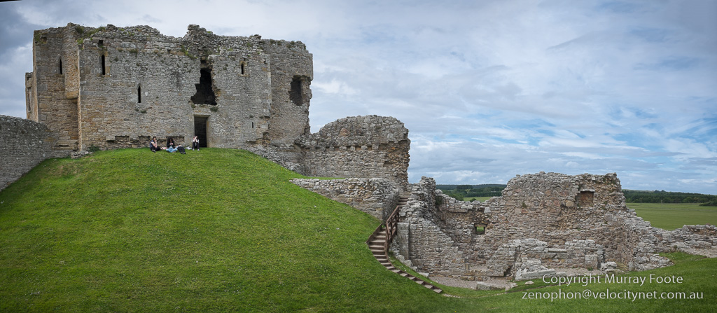 This is a view inside the keep, though with perspective distorted by an extreme wide angle panorama (assembling multiple images).  The holes in the walls are for huge beams over ten metres long that supported the upper floor.