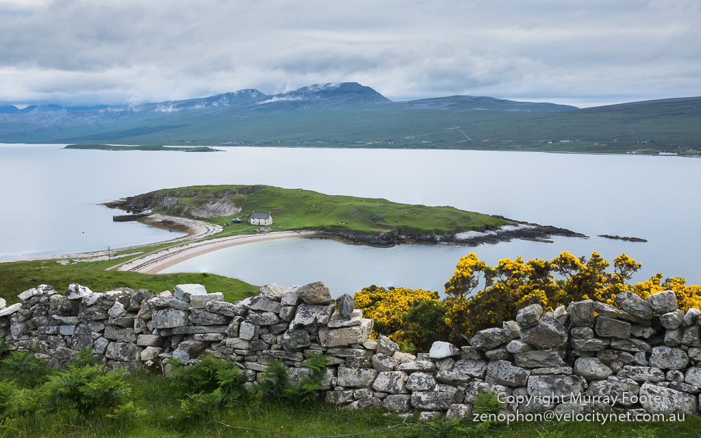 Further on down the road (as Eric Clapton might have said) is Castle Varrich (Caisteal Barraich), seen from the village of Tongue.  This is an ancient simple fort and is somewhere around a thousand years old.  This image is assembled from twelve exposures so the underlying file is quite large.  Click on it for a much larger image.  Then click, use mouse wheel or use icons to zoom into a greater detail of the castle and the surrounding landscape.