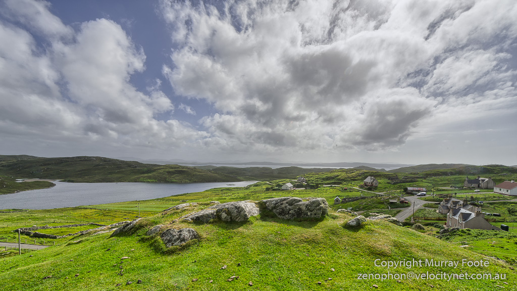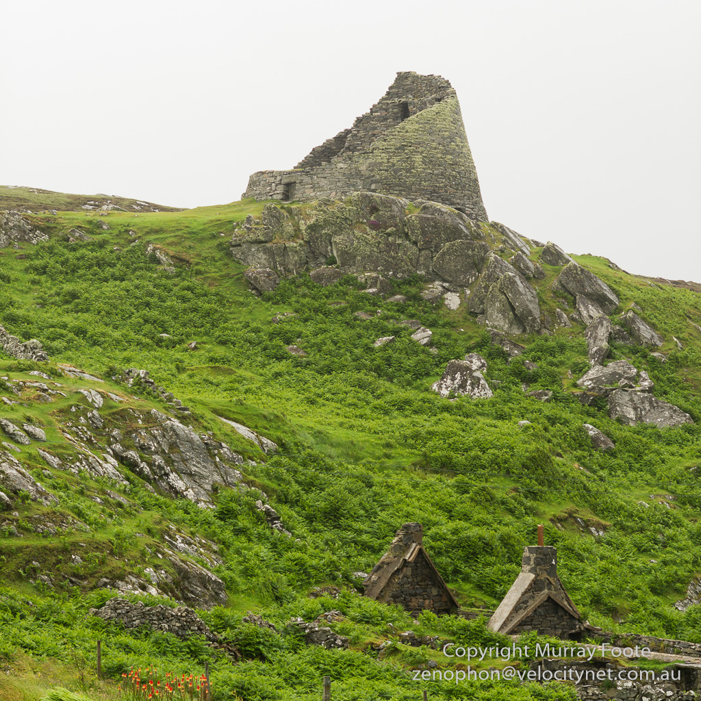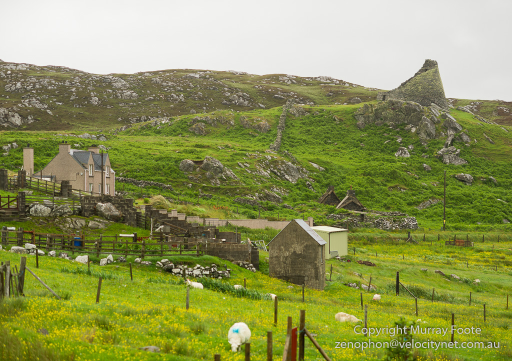 The roofs in the foreground are of abandoned croft houses which may have been built with stone plundered from the broch.  You can also see the commanding defensive position of the broch.