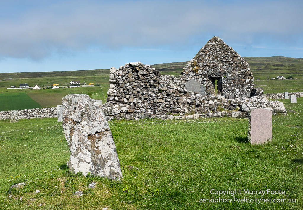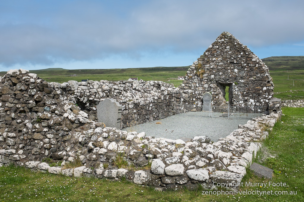 In 1577, the MacLeod clan had massacred 395 MacDonalds, trapped in St Francis Cave in Eigg. The next year, a couple of galleys of MacDonalds landed at Ardmore Bay and surrounded this church, full of MacLeods, who all burned except one girl who escaped. She raised the alarm at Dunvegan Castle and a party of MacLeods sallied forth. The MacDonalds found their galleys had been stranded by the fallen tide. They were all caught and massacred.