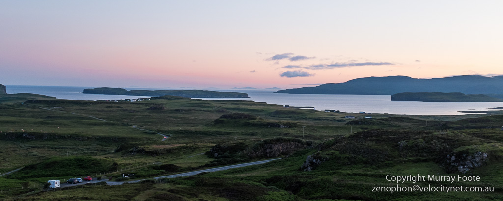 I am walking in to Dun Beag and turn around to see a view over Loch Harport. There is another broch on top of that headland, Dun Ardtrek.
