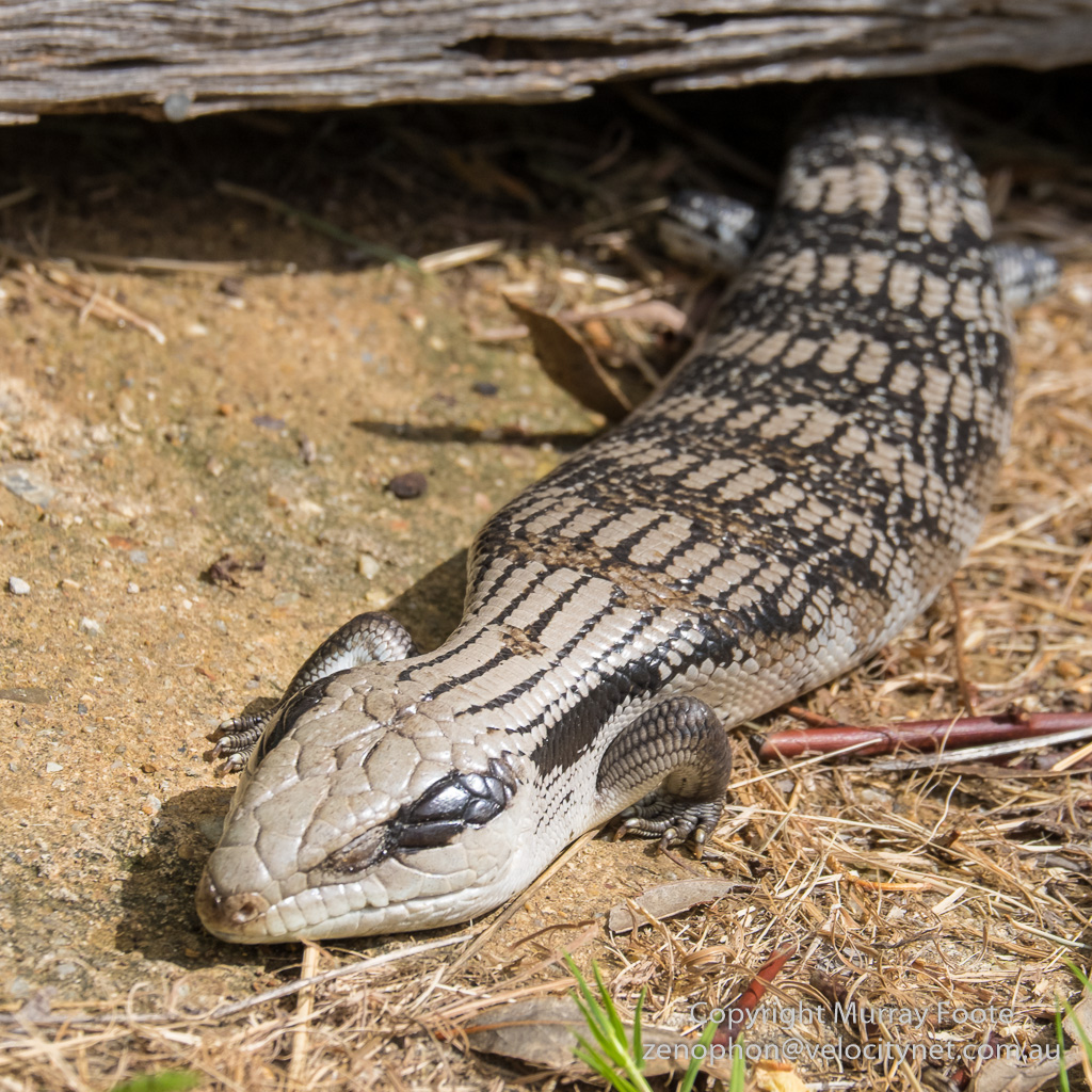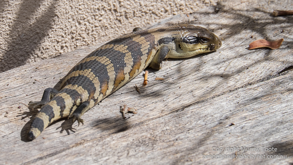 The images show blue-tongued lizards sunning themselves in our garden yesterday, an adult and a young one. These are more specifically the eastern blue-tongued skink, Tiliqua scincoides scincoides. We also have the closely related shinglebacks in our garden.