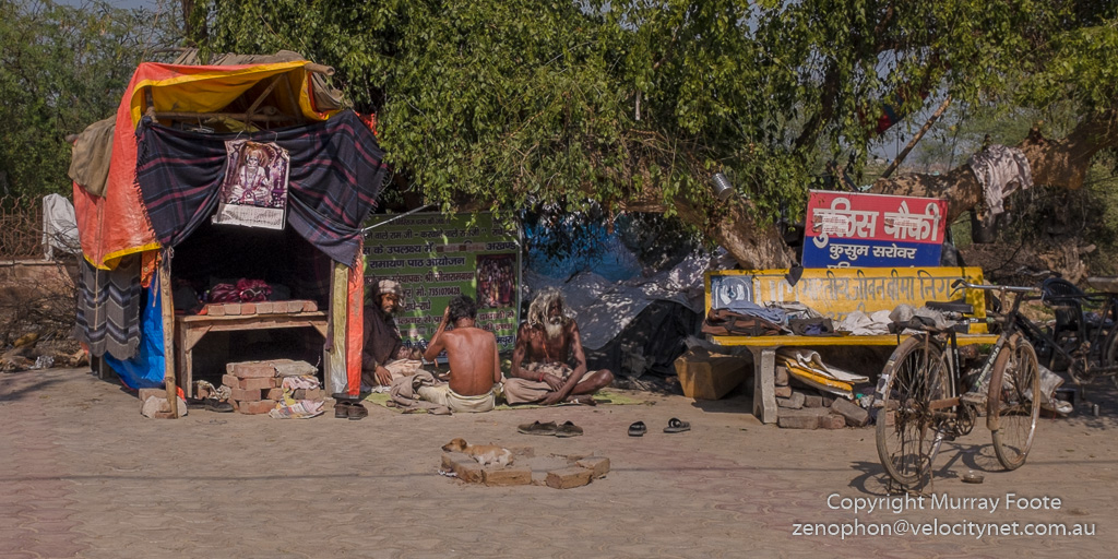 This is still at Govardhan but we are leaving on the bus. This appears to be a makeshift shrine. Three seekers or holy men and their puppy.