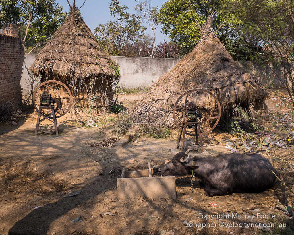 The wheels are a kind of mechanical threshing machine that you can see more clearly if you click on the image. There is a handle on the large wheel to turn it around. I suspect the huts store the green materials used to feed the machines and the output in turn is for animal feed, such as for the buffalo tied up in the foreground.