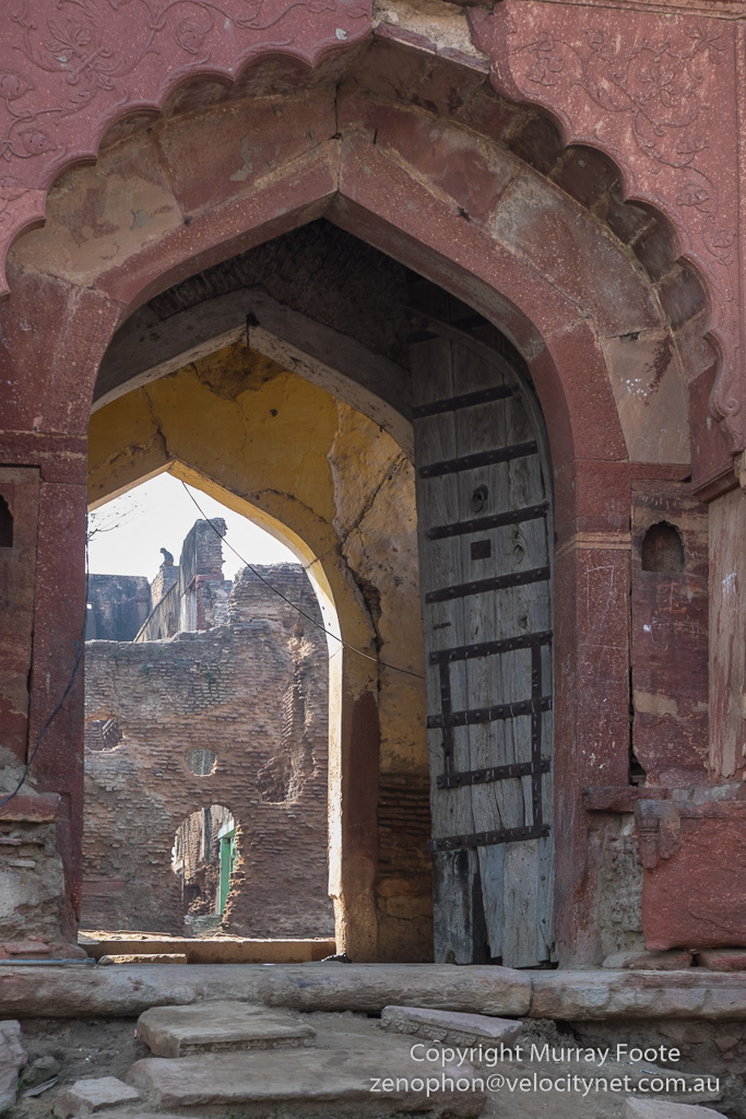 I had a picture of this gateway in the last post with the doors half closed and a group of children.  Walking past it again, here you can see how little remains inside.  Perhaps sacked by Aurangzeb’s forces, I don’t know.