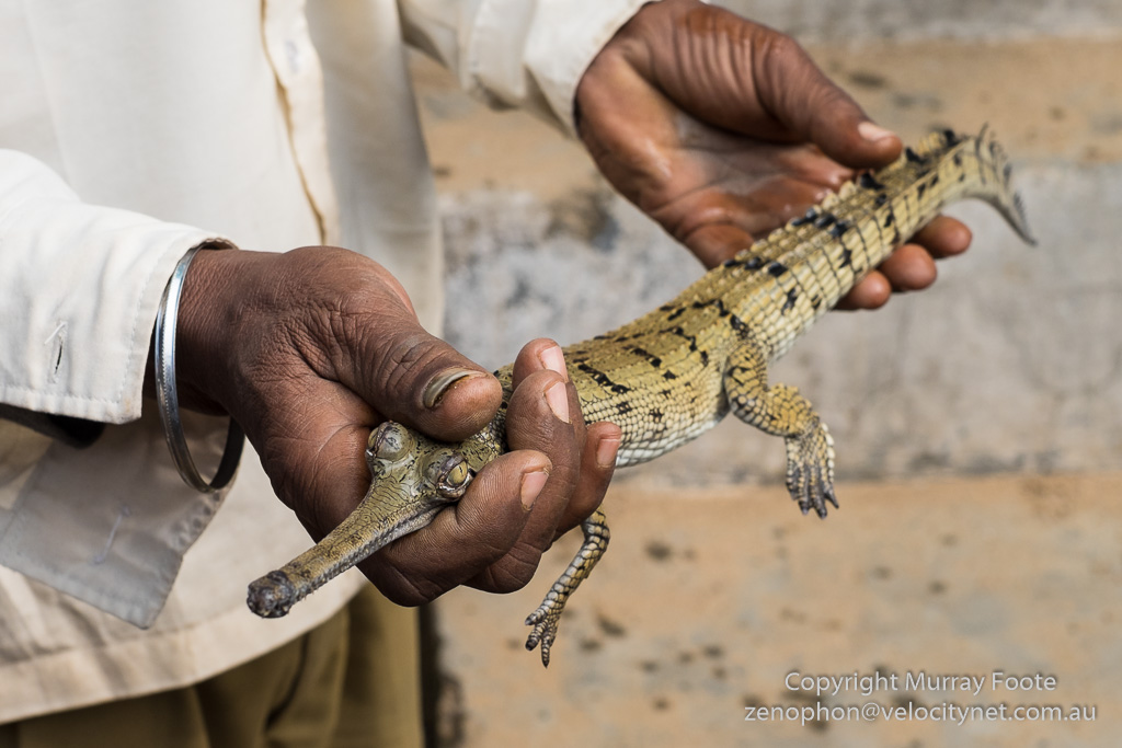 No, no, not in the water together. While on the road between Agra and Gwalior we visited a village and later a crocodile farm.