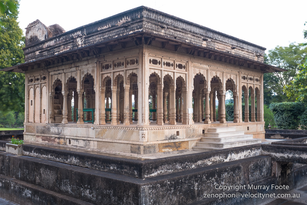 Deo Bagh is a charbagh which is a Persian garden layout with the garden divided into four quarters. Mogul Emperors camped here in the sixteenth century and this is the chhattis-dari (36-pillared pavilion) at its centre. It is surrounded by a moat and there is a room beneath. The women of the court would take refuge in that room as a cool place to hide out in the summer heat.