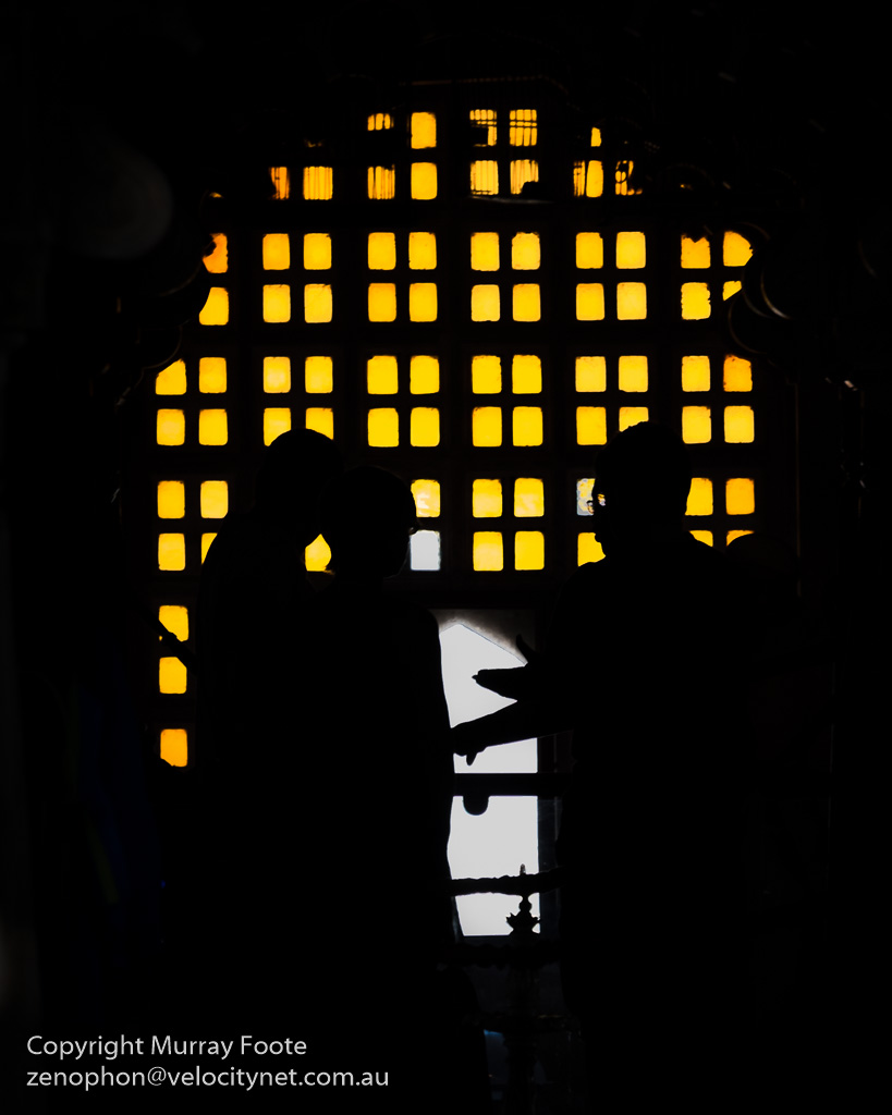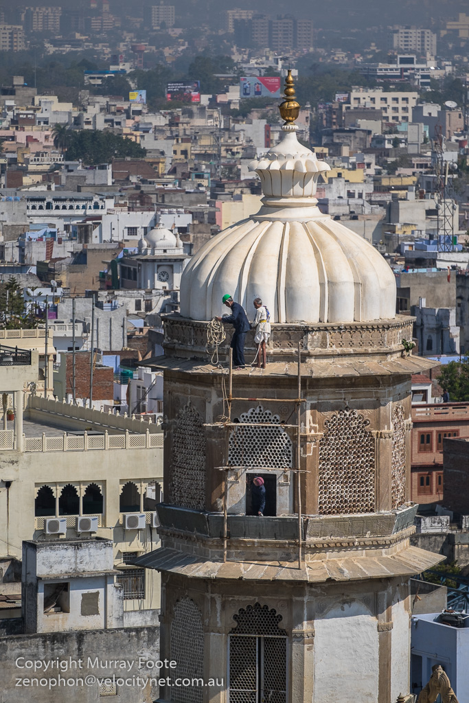 Here we are on our way in to the City Palace in Udaipur. Above us, a worker is dusting the outside of the building.
