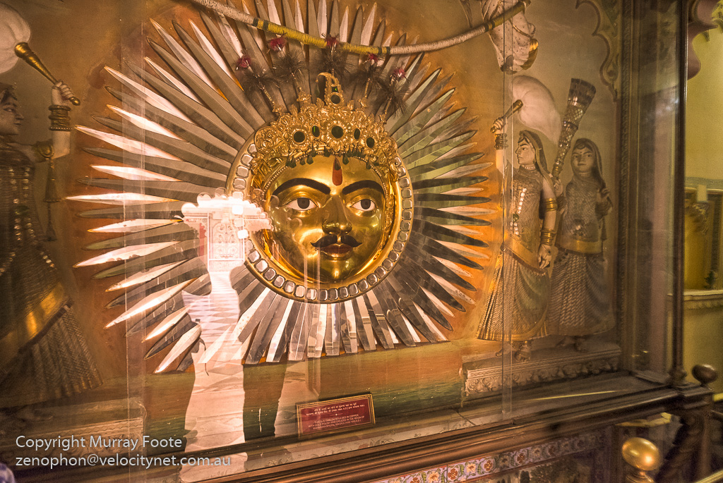 This is the Surya Dev, the Sun God from whom the Sesodia clan of the Maharanas of Mewar were supposed to be descended. This item is quite recent, from the reign of Maharana Bhupal Singh (1930-1955) and probably prior to Indian independence in 1947. It is presumably the Maharana’s face in the middle.