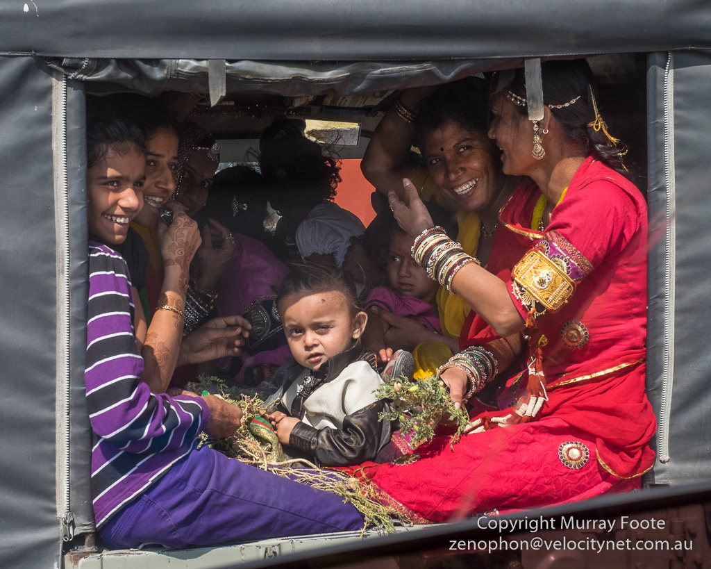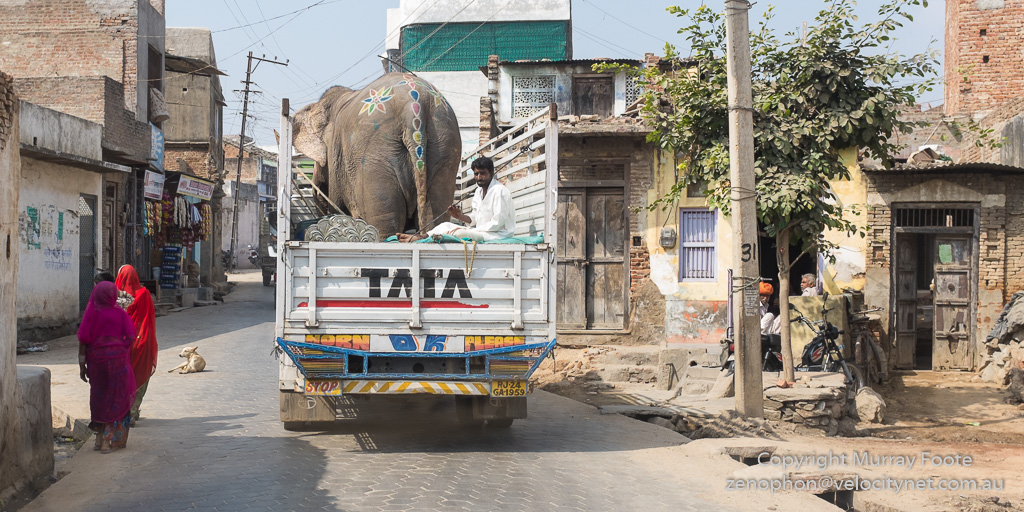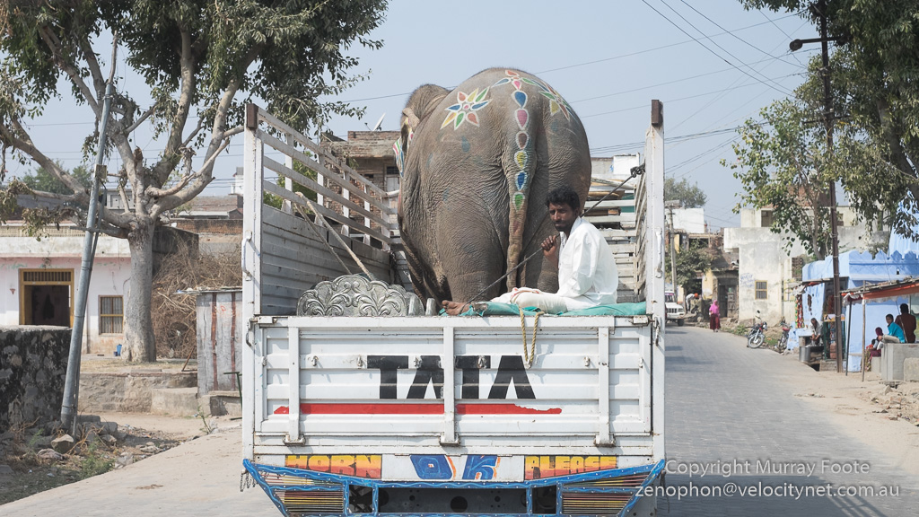 This morning we piled into the bus for a journey to Manvar Desert Camp.  Before too long we had come up behind an elephant, though it was riding in the back of the truck.