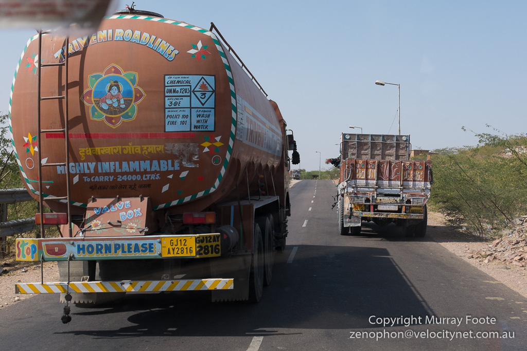 Indian driving.  A truck is overtaking a tanker and a bend is coming up.  There is a cow on the road on the bend and another truck behind it.  Click image if you want to see this more clearly in a larger view.